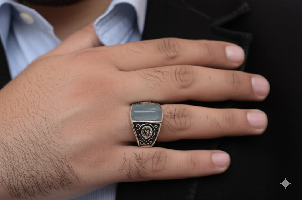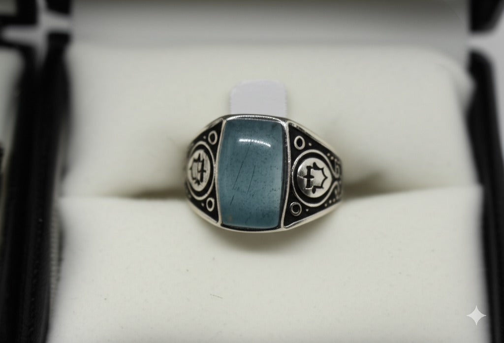 An aquamarine men’s ring showcases a stunning blue aquamarine gemstone, symbolizing tranquility and strength. Set in a bold and stylish design, it offers a refined yet powerful look. Perfect for everyday wear or special occasions, this ring adds a touch of sophistication and elegance.