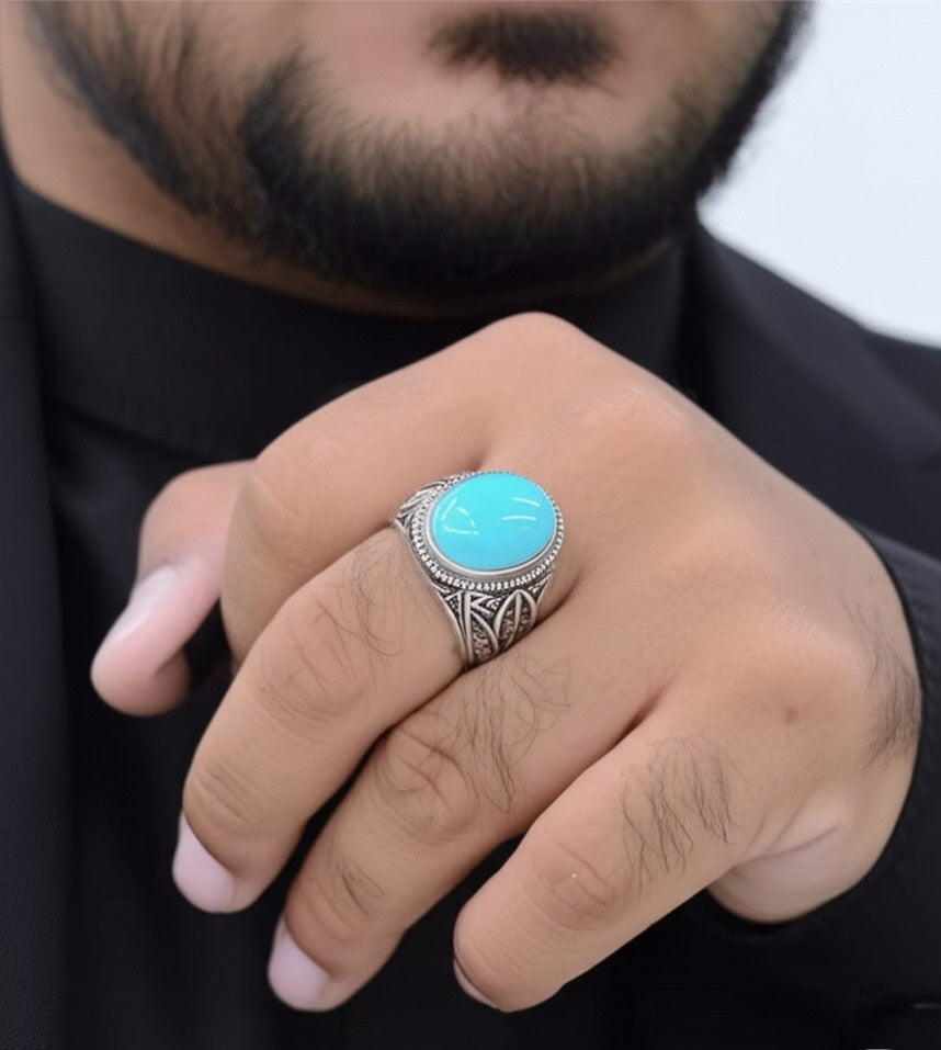 Bold and timeless, this men’s ring features a vibrant turquoise stone set in high-quality sterling silver. Perfect for everyday wear or special occasions, it combines rugged elegance with spiritual symbolism.