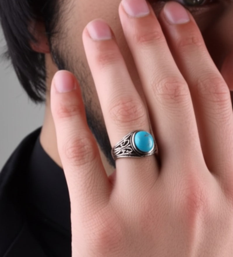 Bold and timeless, this men’s ring features a vibrant turquoise stone set in high-quality sterling silver. Perfect for everyday wear or special occasions, it combines rugged elegance with spiritual symbolism.