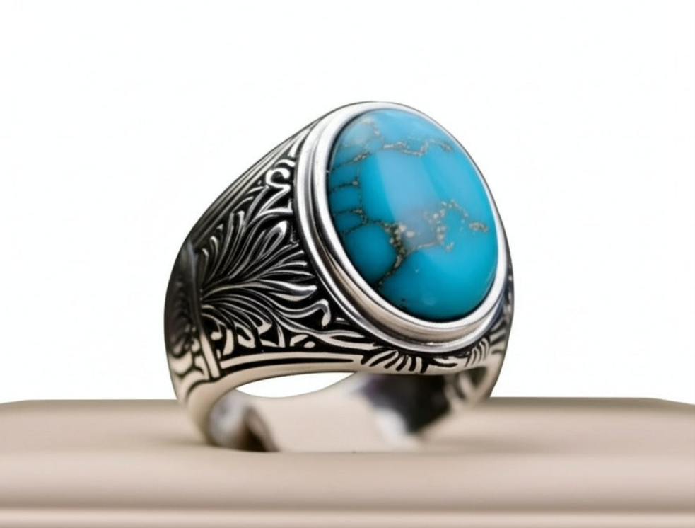 Bold and timeless, this men’s ring features a vibrant turquoise stone set in high-quality sterling silver. Perfect for everyday wear or special occasions, it combines rugged elegance with spiritual symbolism.