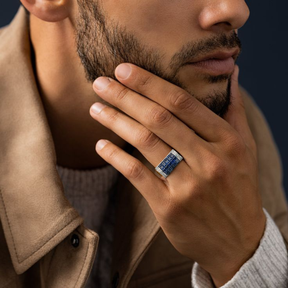 Expertly crafted for the sophisticated gentleman, this men and women sapphire ring boasts timeless elegance and masculine style. Made with the finest sapphires, it exudes strength and confidence. Elevate your look and make a statement with this luxurious accessory.