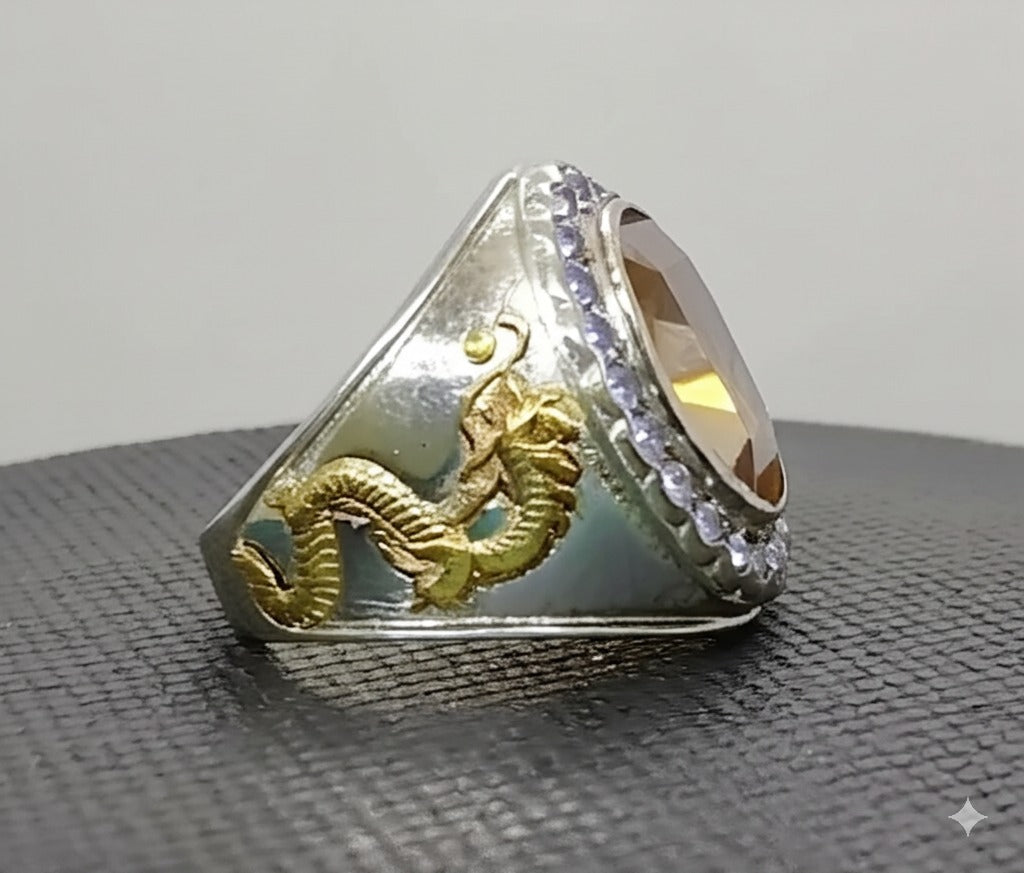 This men’s citrine ring features a stunning yellow citrine stone sourced from Africa. The citrine is known for its deep yellow hue and superior quality, making it a timeless and elegant accessory for any occasion. Crafted with precision and expertise, this ring is a must-have for any man’s jewelry collection