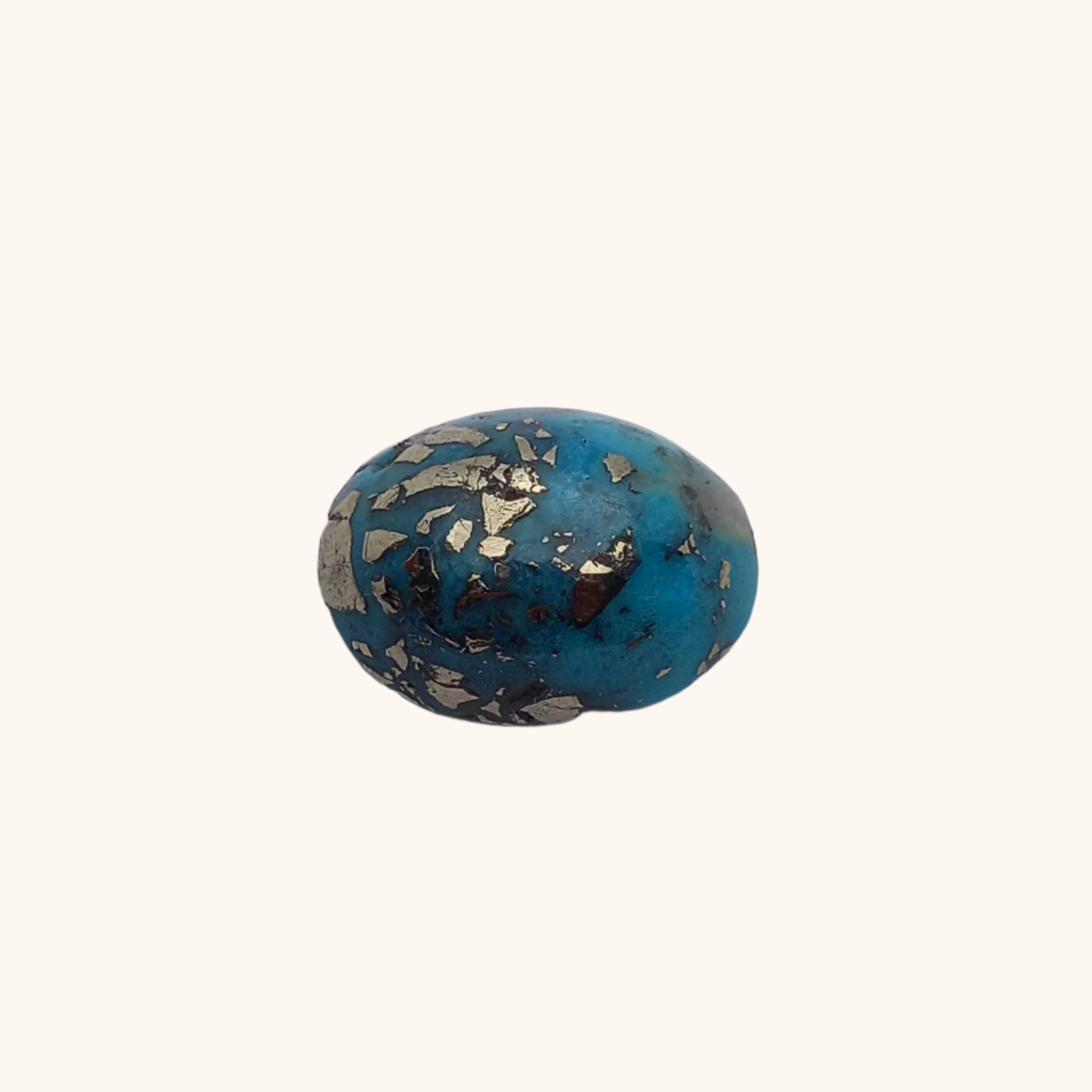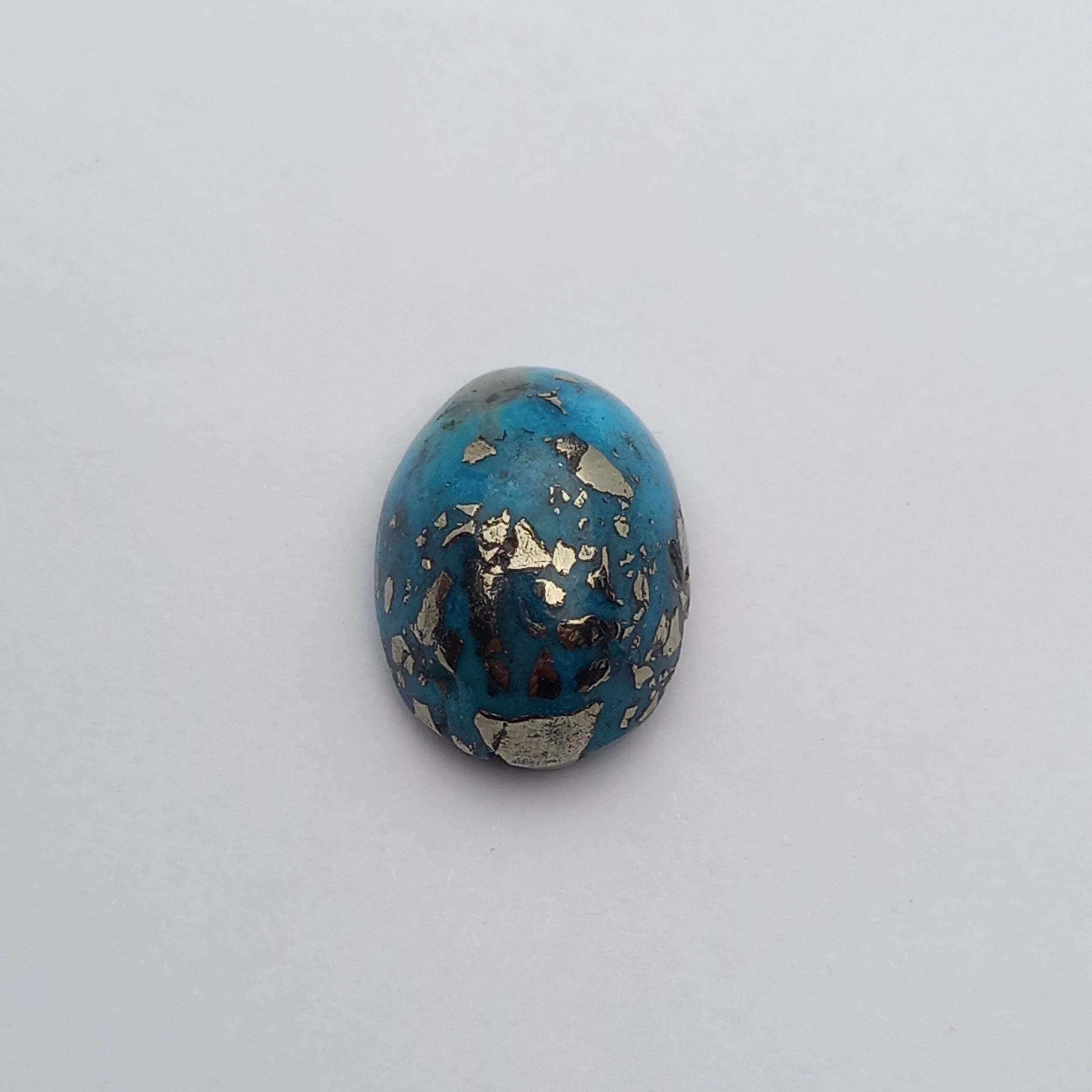 This rare 30.65ct Persian Turquoise with Pyrite blend showcases a gorgeous Persian Blue hue and glimmering silver pyrite. Sourced from high-quality mines, this exquisite gemstone boasts captivating beauty and exceptional durability. Perfect for adding a touch of elegance to any jewelry design.