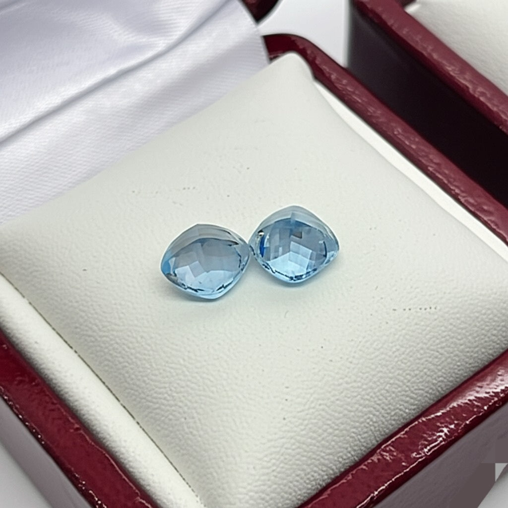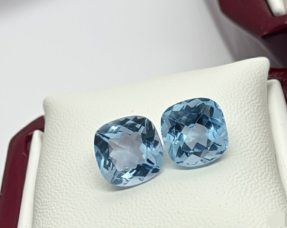 A round pair of sky-blue gemstones from Brazil features a light, airy blue hue with good clarity and brilliance. These stones are often used in jewelry for their refreshing color and affordability.