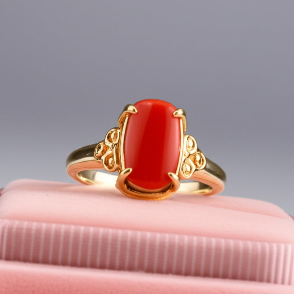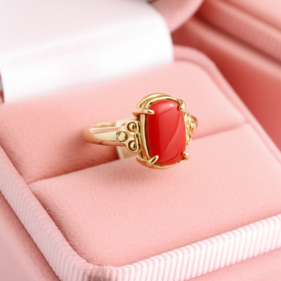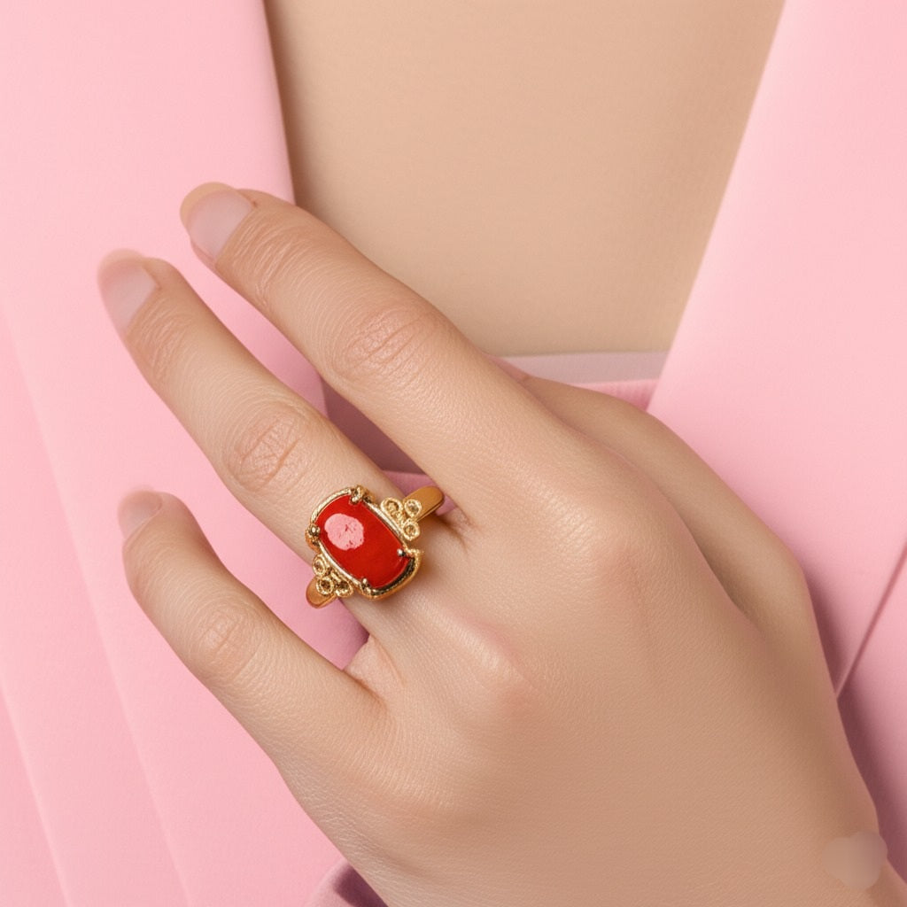 “Embrace the beauty of the Southwest with this Italian coral ring. Featuring a vibrant red stone with natural matrix , this ring exudes rustic elegance and timeless charm.”
