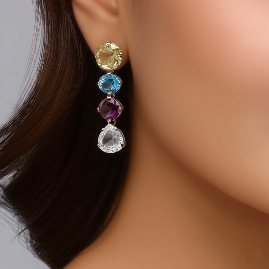 Multi-stone women’s earrings are elegant accessories that incorporate multiple gemstones into their design, offering a vibrant and colorful aesthetic. These earrings come in various styles, such as studs, hoops, jhumkas, and chandeliers, and are crafted using different metals, including yellow, white, and rose gold. The combination of various gemstones not only enhances the visual appeal but also allows for versatile styling, making them suitable for both traditional and contemporary outfits. For instance, Kalyan Jewellers offers multi-stone earrings that add glamour to any ensemble, available in lightweight, trendy, and contemporary models. Additionally, Tanishq’s Vibrant Floral Navratna Multi-Stone Stud Earrings feature a regal combination of multiple dazzling colors, enhancing the opulence of traditional Indian festivities. These earrings are perfect for adding a splash of sophistication and color to any outfit, reflecting the wearer’s multifaceted personality.