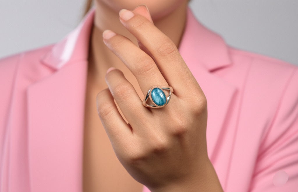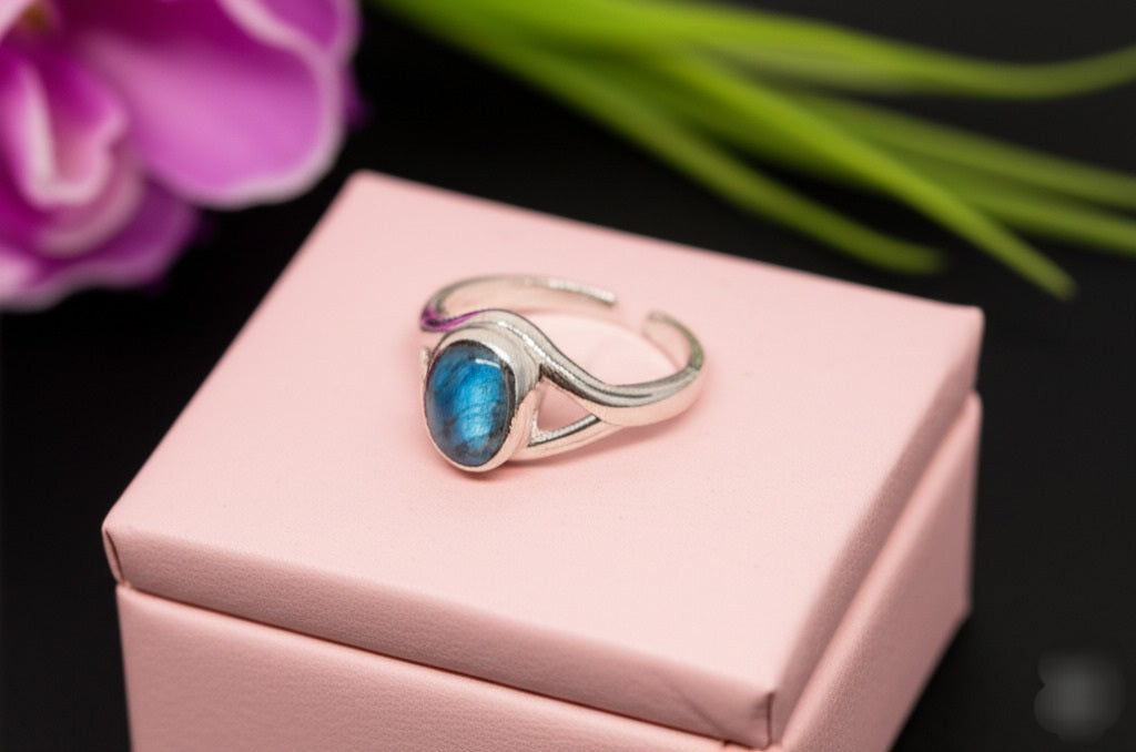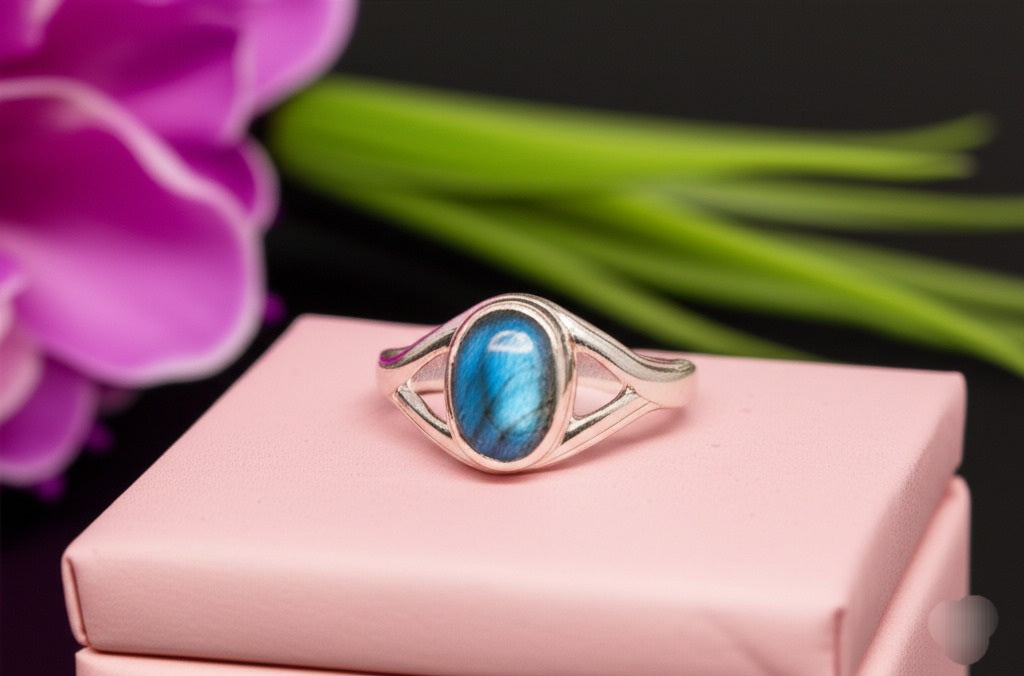 This piece of grey blue labradorite ring is a stunning women’s ring addition to any collection. When hit by light, it shimmers with captivating shades of blue, green, and yellow. A must-have for anyone who appreciates natural gemstones.